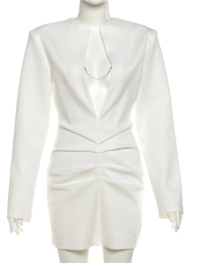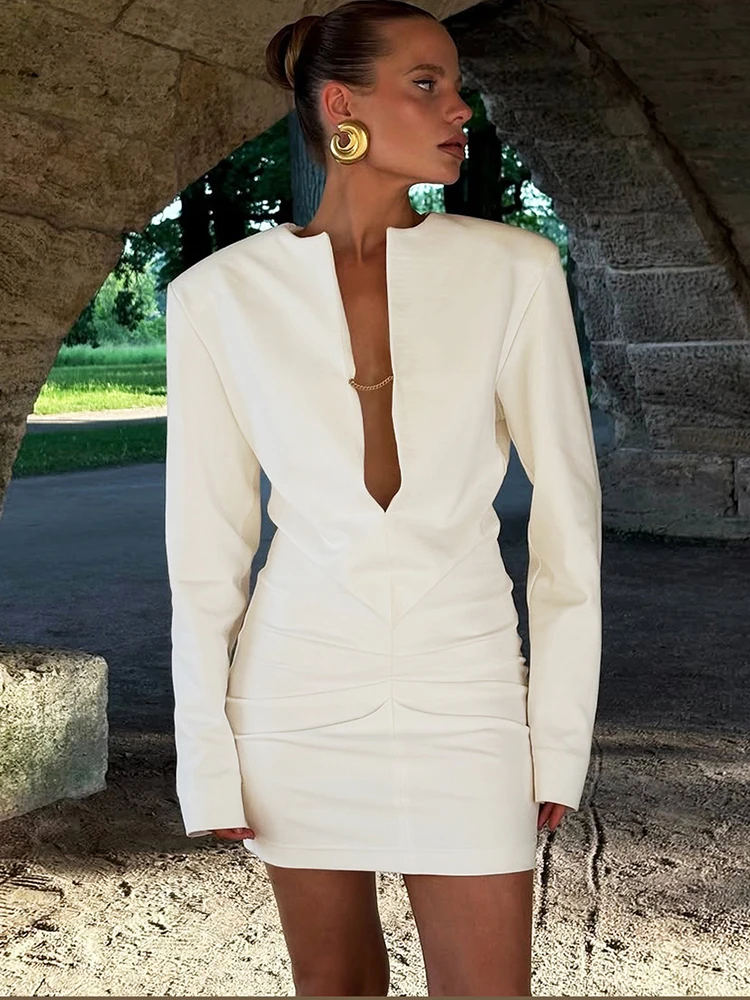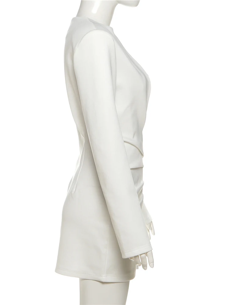 kliou Vestido mini clásico plisado para mujer, otoño, liso, plisado, manga larga, escote en V profundo, ajustado, básico, para festivales callejeros